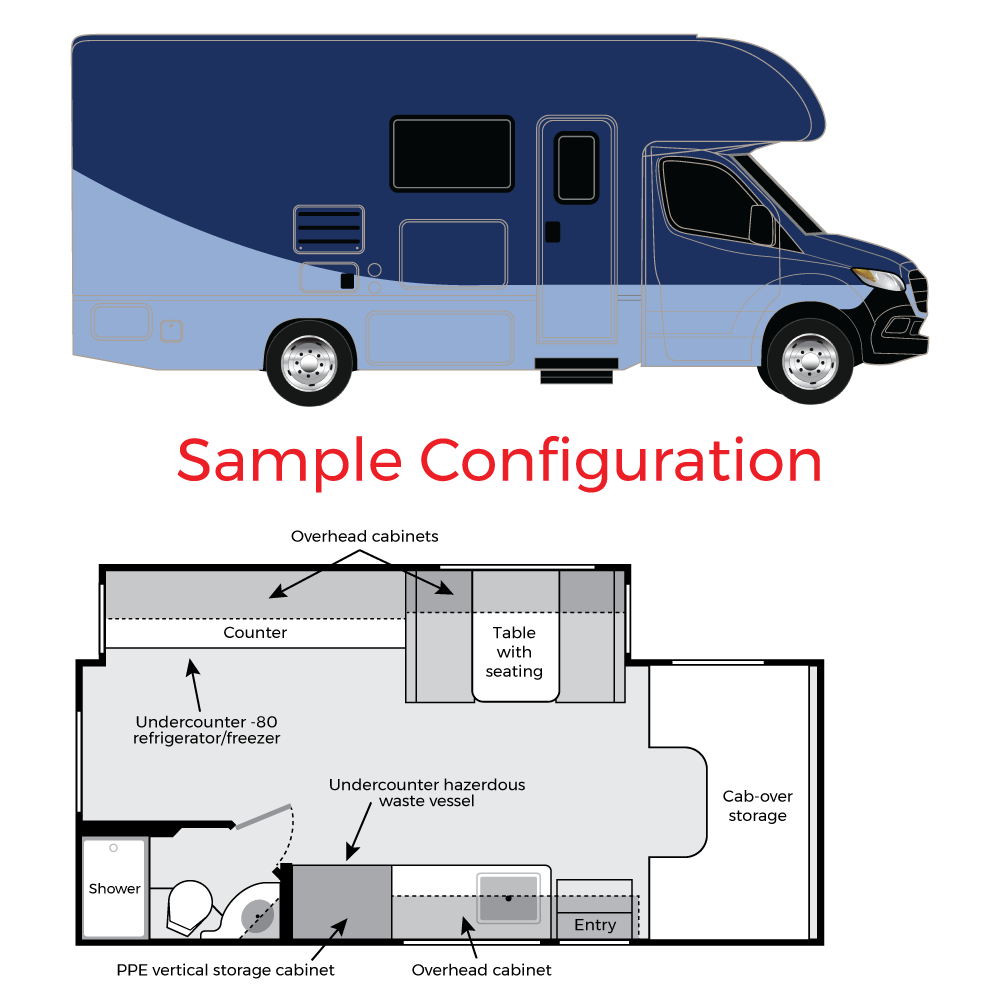 Finally, to further minimize exposure risk, the optional rinse down system routes effluent to collection via the drain/collection system incorporated into the underside of the vehicle and disposed of in a safe and proper manner (as determined by owner Standard Operating Procedures and recommendations of health officials). With this option, all interior components (wall and floor surfaces, PPE cabinetry, power supply housing, freezer housing, etc.) feature sealed access and are designed for rinse down without damage to contained materials.