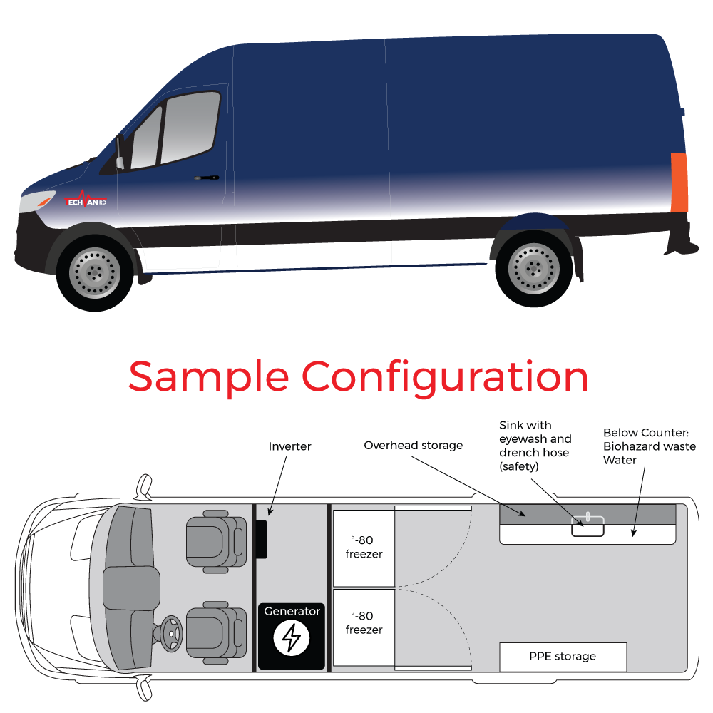 The TechVan RD Vaccination Station includes two 3.3 cu. Ft. -80-degree freezer, for maintaining the COVID vaccine in accordance with manufacturer’s recommendations. Each freezer operates for up to two + days without power using the unique power source described below. The configuration can be modified to include a -20 freezer, a pharmaceutical refrigerator, or any combination of the above.
